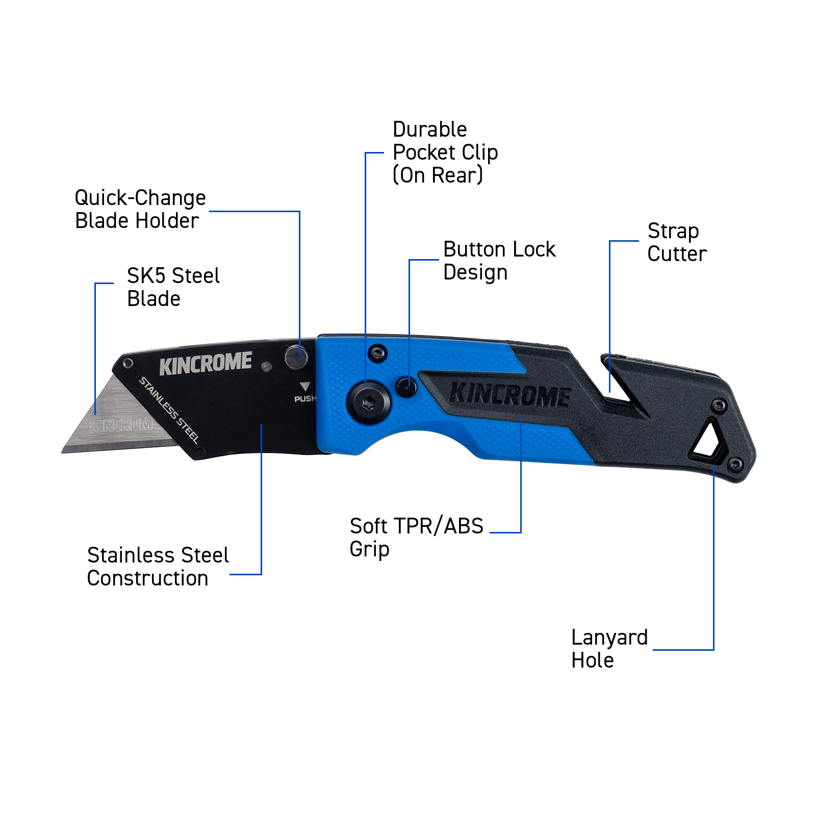 Swap blades effortlessly with the quick-change blade holder mechanism, and stay ready with an integrated pocket clip and lanyard hole.