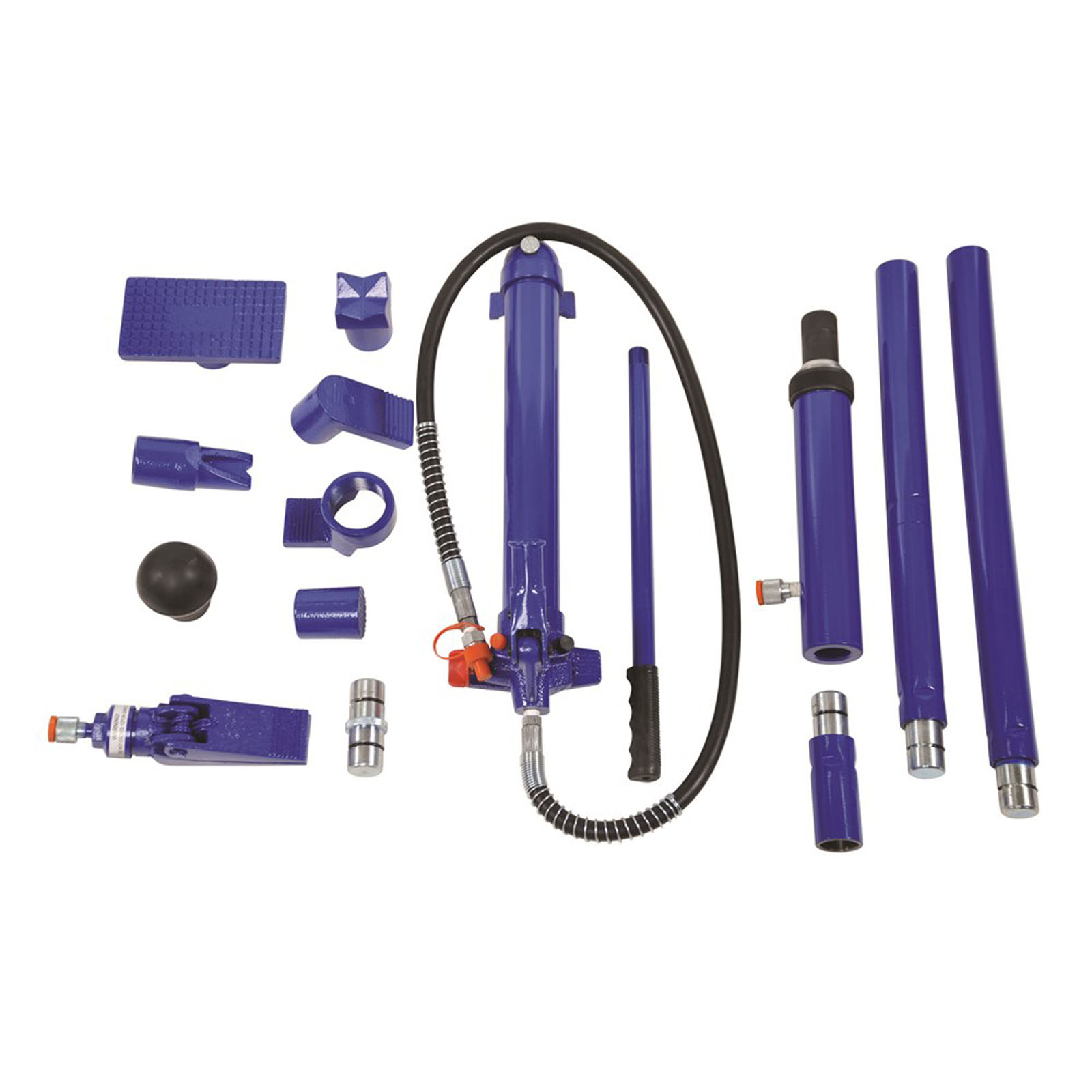 10 Ton Hydraulic Body Repair Kit 15 Piece: Cleft Toe, V Base, Male Connector, 10 Tonne Pump Unit, Ram Unit, Hydraulic hose