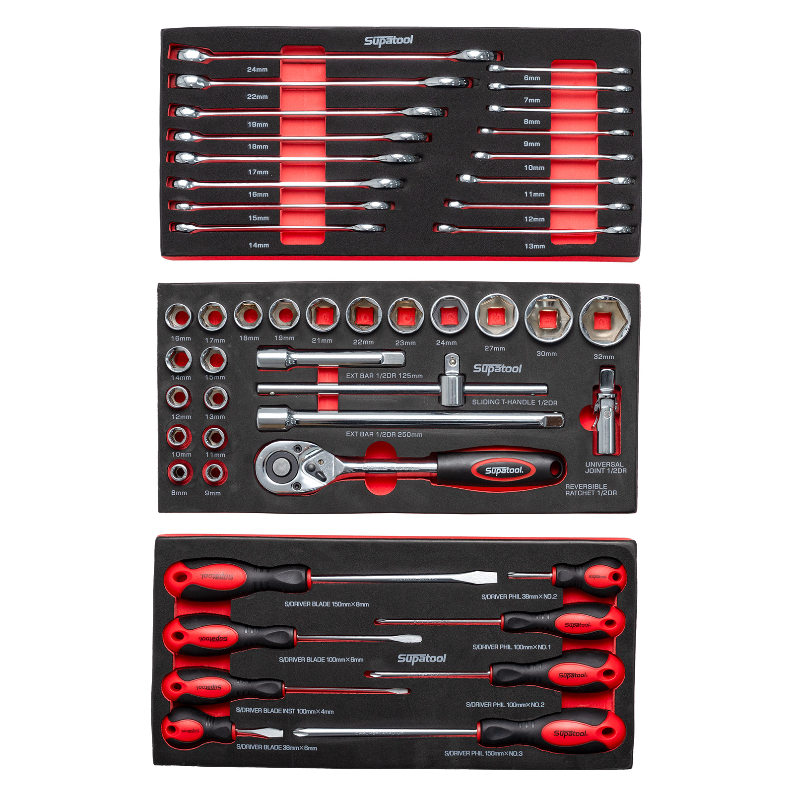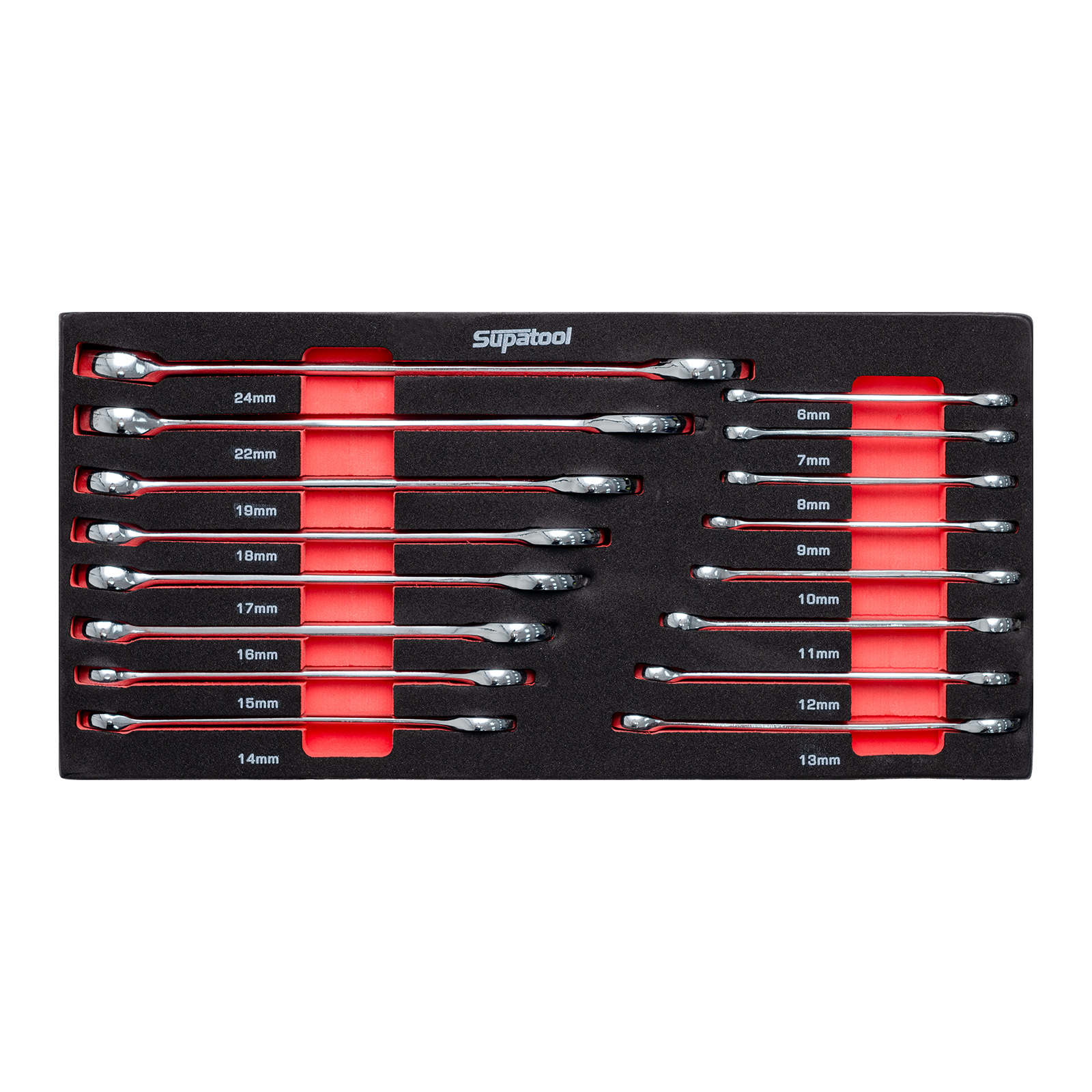 - 16 Combination Spanners: 6, 7, 8, 9, 10, 11, 12, 13, 14, 15, 16, 17, 18, 19, 22, 24mm
