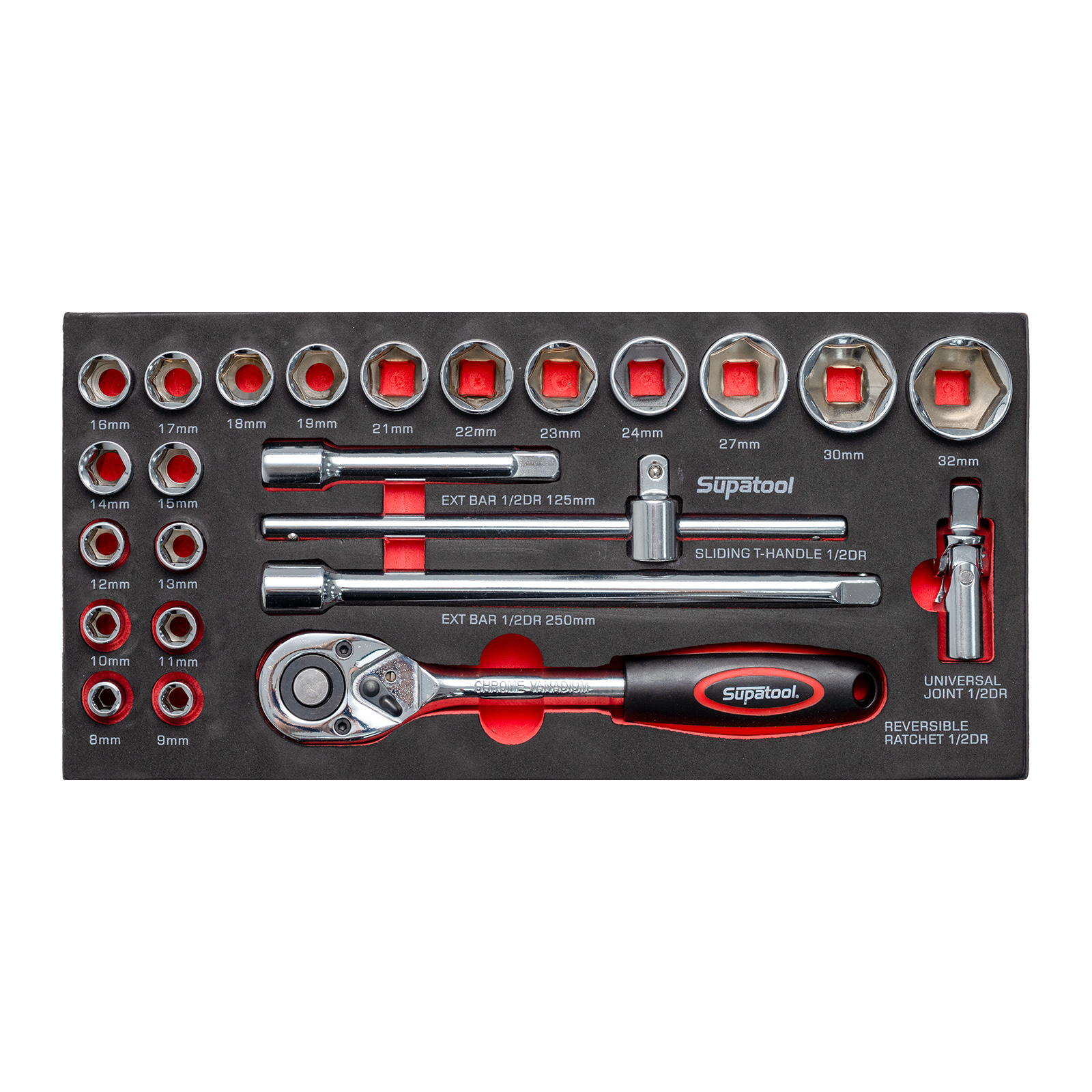 - 19 Sockets 1/2" Square Drive: 8, 9, 10, 11, 12, 13, 14, 15, 16, 17, 18, 19, 21, 22, 23, 24, 27, 30, 32mm